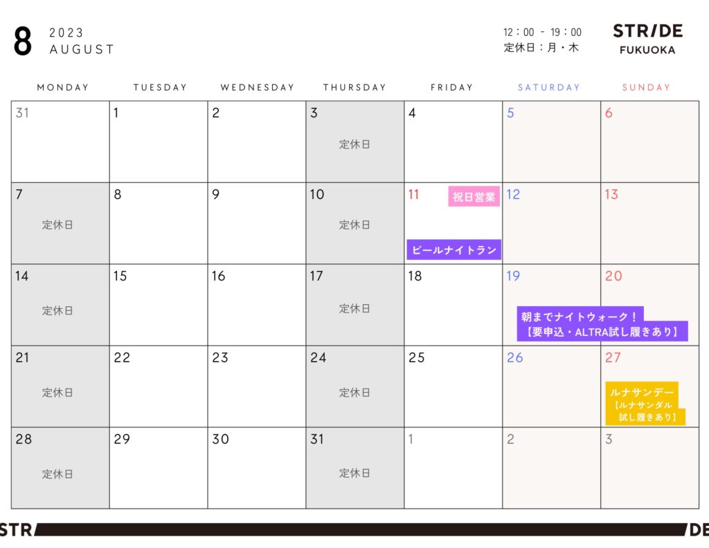 STRIDE LAB 福岡 8月スケジュールのお知らせ(ビールナイトラン、100キロウォーク練習、ルナサンデー)