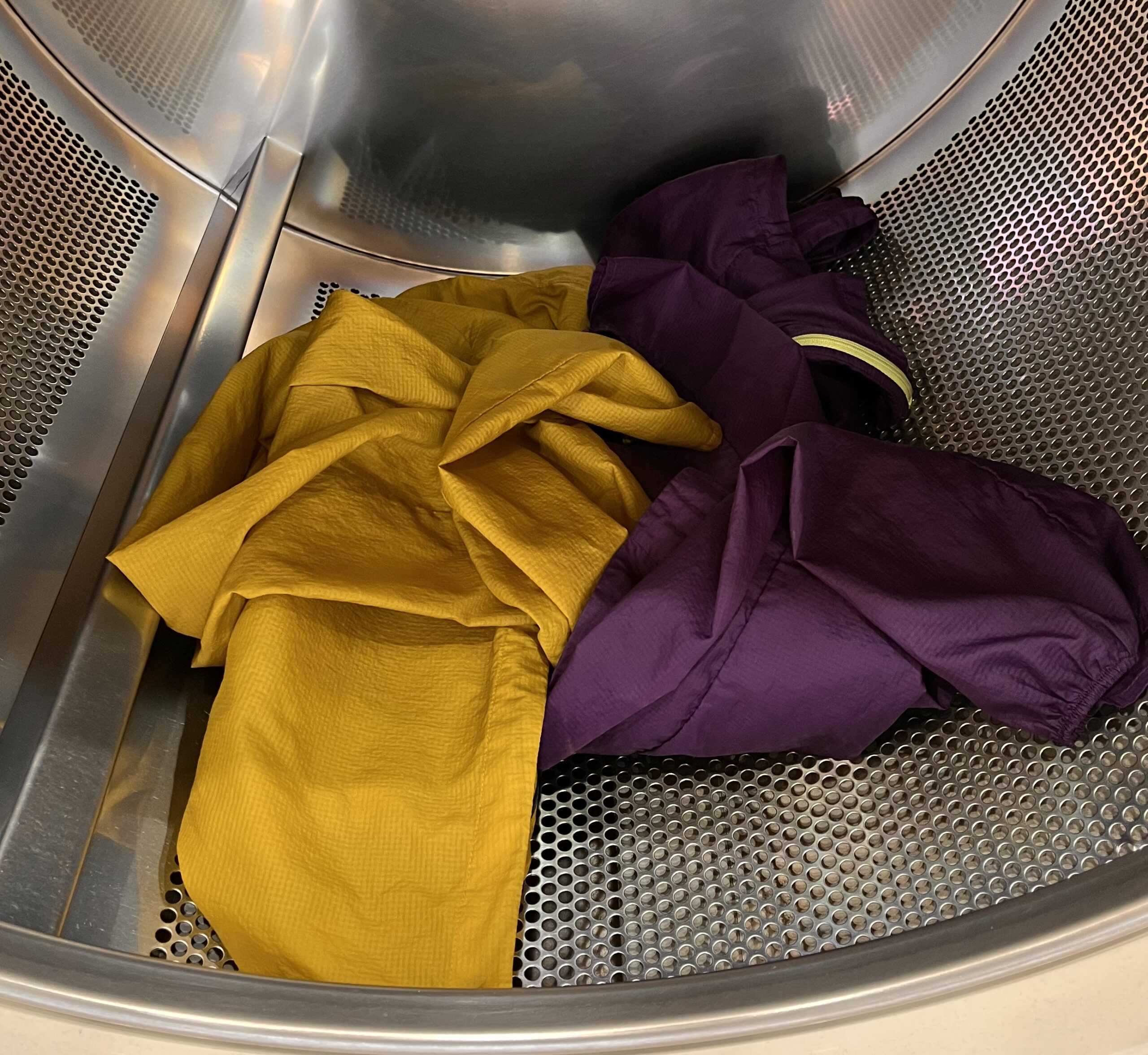 レイン、ウィンドシェル共に専用洗剤で洗濯し、つけ置きの撥水加工を施し、ウィンドシェルはコインランドリーで低温で乾燥。レインウエアは当て布をしながら、アイロンをかける事で新品同様の撥水と張り感が復活。