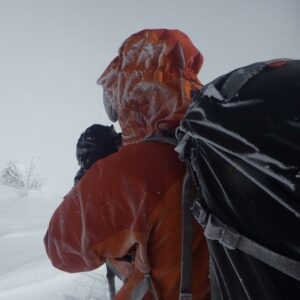 写真6:強風の中、稜線を進む。中に着ているインサレーションのおかげで寒さに耐えられる