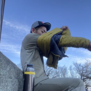写真5:休憩時の汗冷え対策にダウンを着込む