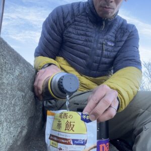 写真4:山頂でダウンジャケットを着込んで昼休憩